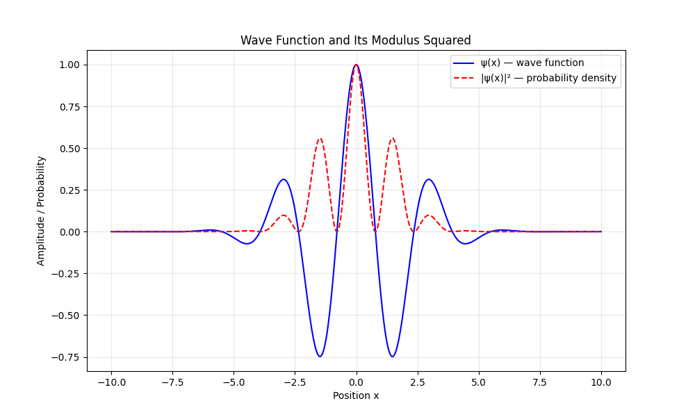 The figure below shows how the wave function (blue curve) and its squared modulus (red dashed line) look. \(\psi(x)\) can change sign, positive or negative — this is the amplitude of possibility, while \(|\psi|^2\) is always positive and shows where the system is most likely to appear.